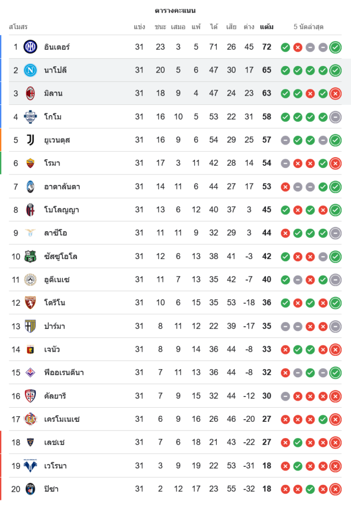 สถานการณ์ในตารางคะแนนกัลโช่ เซเรีย อา