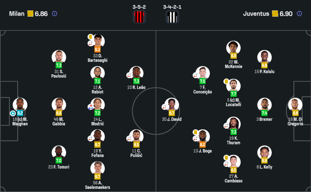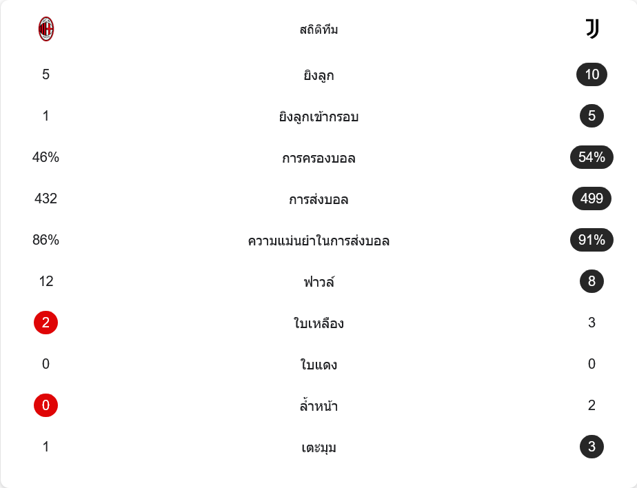ยูเวนตุสในระบบ 3-4-2-1 เล่นเป็นทรงกว่า โดยเฉพาะริมเส้นที่ คอนไซเซา สร้างปัญหาให้มิลานต่อเนื่อง ส่วน โลคาเตลลี่ คุมแดนกลางยอดเยี่ยม ทั้งตัดเกมและออกบอล อย่างไรก็ตาม จุดอ่อนใหญ่คือการจบสกอร์ ยิงเยอะกว่า เข้ากรอบมากกว่า แต่ยังไม่เด็ดพอจะเอาชนะผู้รักษาประตูมิลาน