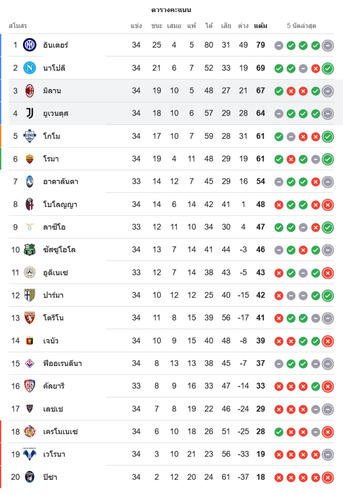 สถานการณ์ในตารางคะแนนกัลโช่ เซเรีย อา