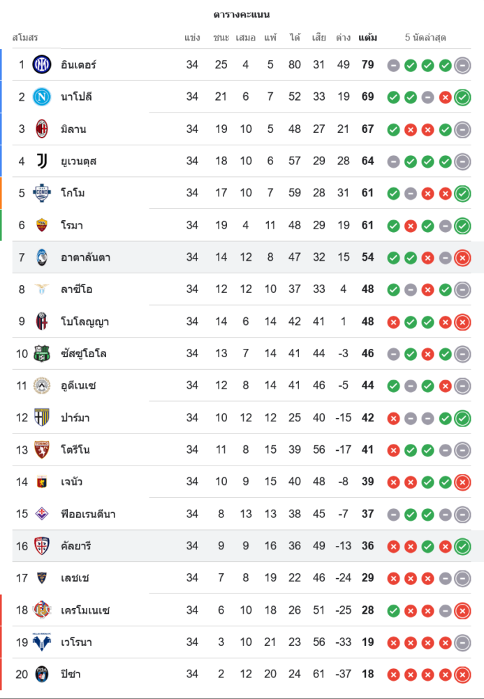 กายารี่เก็บเพิ่มเป็น 36 คะแนน จาก 34 นัด รั้งอันดับ 16 และได้ชัยชนะที่สำคัญมากต่อการหนีโซนตกชั้น ส่วนอตาลันต้ายังอยู่ที่อันดับ 7 มี 54 คะแนน แต่ความพ่ายแพ้นัดนี้ทำให้เส้นทางลุ้นพื้นที่ยุโรปสะดุดแรง โดยเฉพาะเมื่อเกมรุกสร้างโอกาสได้เยอะ แต่เกมรับเสียประตูง่ายเกินไป