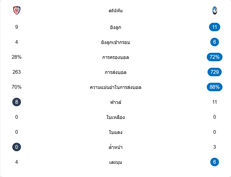 อตาลันต้ายิง 11 ครั้ง เข้ากรอบ 6 ครั้ง ครองบอล 72% ส่งบอล 729 ครั้ง แม่นยำ 88% ได้เตะมุม 6 ครั้ง และล้ำหน้า 3 ครั้ง ส่วนกายารี่ยิง 9 ครั้ง เข้ากรอบ 4 ครั้ง ครองบอล 28% ส่งบอล 263 ครั้ง แม่นยำ 70% ได้เตะมุม 4 ครั้ง และไม่มีล้ำหน้าเลย แม้ตัวเลขส่วนใหญ่เป็นของทีมเยือน แต่ความเฉียบคมและการป้องกันจังหวะสุดท้ายทำให้เจ้าบ้านเป็นฝ่ายคว้าชัย