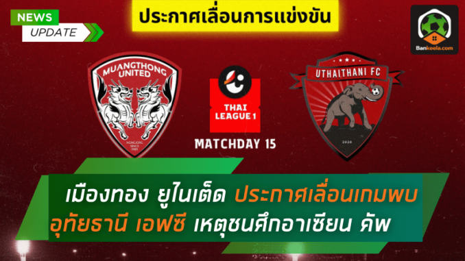 สโมสรฟุตบอล เมืองทอง ยูไนเต็ด (MTUTD) ได้ออกแถลงการณ์สำคัญเกี่ยวกับการแข่งขัน ฟุตบอลไทยลีก 2024-25 นัดที่ 15 ซึ่งเดิมมีกำหนดลงสนามพบกับ อุทัยธานี เอฟซี ในวันเสาร์ที่ 4 มกราคม 2025 ณ สนามธันเดอร์โดม อย่างไรก็ตาม เนื่องจากวันแข่งขันดังกล่าวตรงกับ ศึกฟุตบอลอาเซียน คัพ 2024 ทำให้ต้องมีการเลื่อนการแข่งขันออกไป