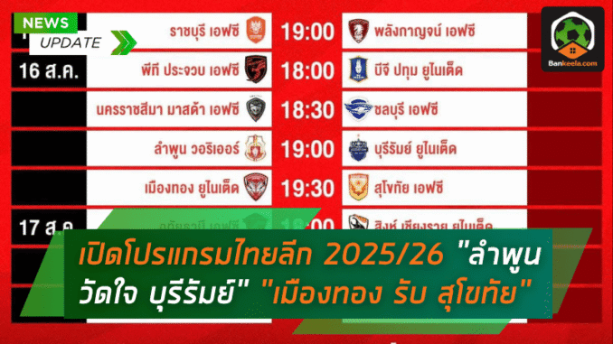ระอุตั้งแต่นัดแรก! เปิดโปรแกรมไทยลีก 2025/26 ลำพูนวัดใจบุรีรัมย์ เมืองทองรับสุโขทัย ท่าเรือชนอยุธยา บีจีเยือนประจวบ เดือดทุกสนาม