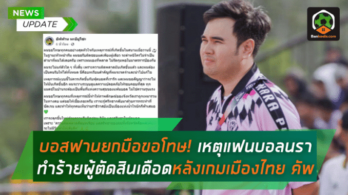 เหตุการณ์สุดเดือดที่เกิดขึ้นในเกม เมืองไทย คัพ 2025/26 รอบคัดเลือก รอบสอง คู่ระหว่าง นรา ยูไนเต็ด เปิดบ้านพ่าย สตูล ยูไนเต็ด 0-1 กลายเป็นประเด็นร้อนสะเทือนวงการลูกหนังไทย เมื่อแฟนบอลเจ้าถิ่นรายหนึ่งปาขวดใส่ศีรษะผู้ตัดสินหลังจบเกม จนเป็นที่วิพากษ์วิจารณ์อย่างหนักในโลกโซเชียล ล่าสุด “บอสฟาน” อัฟฟาน หะยียูโซะ ประธานสโมสร ออกมาแสดงความรับผิดชอบต่อเหตุการณ์ทั้งหมด พร้อมกล่าวขอโทษทุกฝ่ายอย่างตรงไปตรงมา