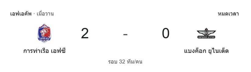 - ⏱️ จบเกม การท่าเรือ เอฟซี ชนะ ทรู แบงค็อก ยูไนเต็ด 2-0 ผ่านเข้าสู่รอบ 16 ทีม ช้าง เอฟเอ คัพ