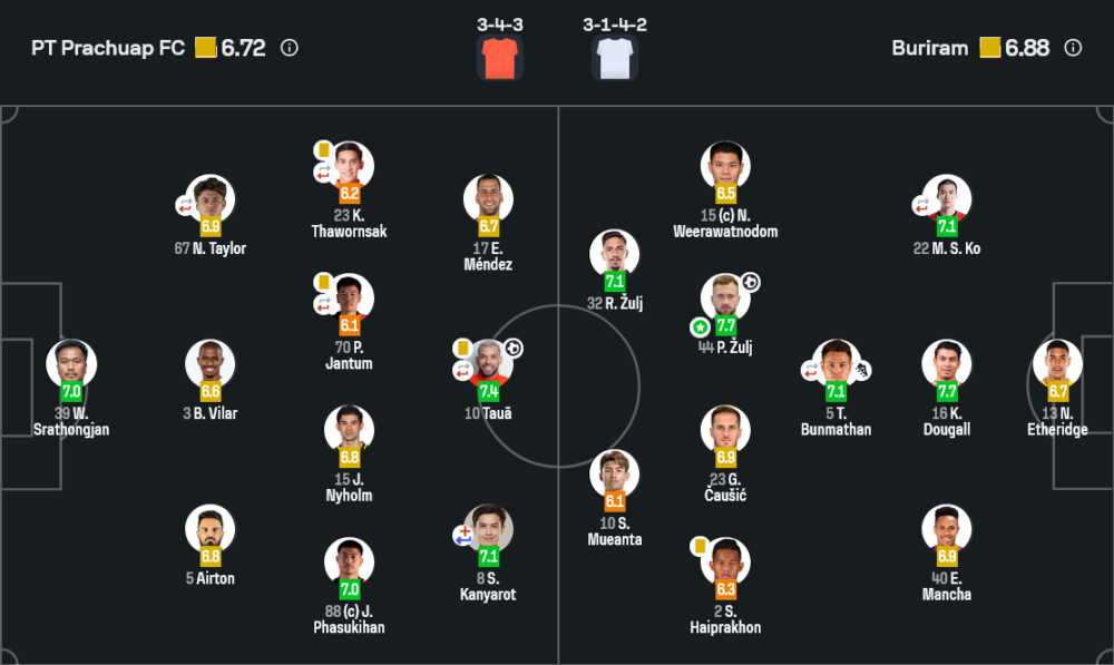 📋 รายชื่อ 11 ตัวจริง คะแนน และการเปลี่ยนตัว
