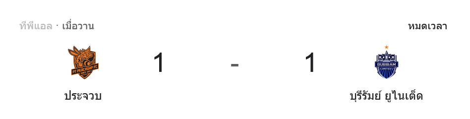 บ้านกีฬา ขอย้ำสกอร์เต็มเสียง จบ 90 นาที พีที ประจวบ เอฟซี เสมอ บุรีรัมย์ ยูไนเต็ด 1-1 แบ่งกันไปทีมละแต้มแบบมีทั้งเสียดายและโล่งอกในเกมเดียวกัน