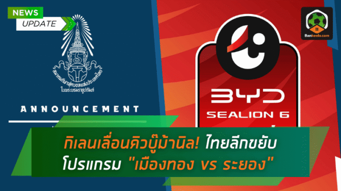 สมาคมกีฬาฟุตบอลแห่งประเทศไทยออกประกาศปรับ โปรแกรมการแข่งขัน ศึก BYD SEALION 6 LEAGUE 1 ฤดูกาล 2025/26 ในเกมที่ เมืองทอง ยูไนเต็ด เตรียมเปิดรังธันเดอร์โดม สเตเดียม รับการมาเยือนของ ระยอง เอฟซี เดิมทีเกมนี้ถูกวางไว้ในวันศุกร์ที่ 23 มกราคม 2569 เวลา 19.00 น. แต่เนื่องจากมีคิวบอลถ้วยเบียดเข้ากลางสัปดาห์ ทำให้ต้องขยับวันแข่งออกไปเพื่อบริหารสภาพร่างกายนักเตะและคุณภาพของเกมในสนามให้ดีที่สุด