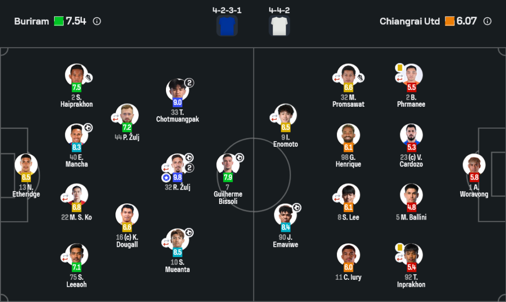 รูปเกมทั้ง 90 นาทีสะท้อนชัดจากตัวเลขในสนาม บุรีรัมย์ครองบอลเหนือกว่าชัดเจน จ่ายบอลกันลื่นไหลในแดนคู่แข่งแทบตลอดครึ่งหลัง จำนวนโอกาสยิงเข้ากรอบมากมายหลายครั้ง บางลูกชนเสาหรือถูกอภิรักษ์ซูเปอร์เซฟ ยังไงประตูที่ได้ถึง 8 ลูกถือว่าไม่เกินจริง ฝั่งเชียงรายมีจังหวะโต้กลับที่น่ากลัวอยู่ไม่กี่ครั้ง โดยส่วนใหญ่พึ่งความเร็วและการลากเลื้อยของเอ็มมาวีเวเป็นหลัก แต่เมื่อต้องตั้งเกมบุกเองกลับเจอแนวรับเจ้าถิ่นปิดพื้นที่หมด การฟาวล์ตัดเกมและใบเหลืองหลายครั้งยิ่งทำให้ทีมเยือนเสียจังหวะไล่คืน และปล่อยให้บุรีรัมย์เดินเกมสบายเท้าจนสกอร์ไหล