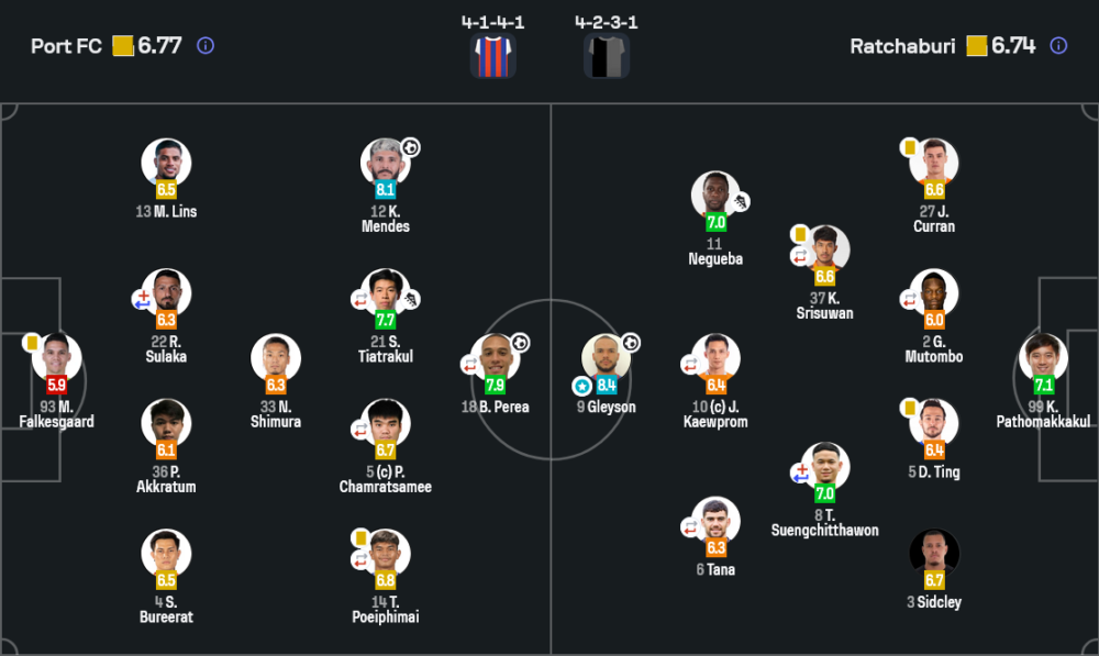 - สิทธา บุญหล้า (6.6) ลงนาที 79 แทน พีรดล ฉ่ำรัศมี ช่วยปิดเกมแดนกลางช่วงทดเจ็บ