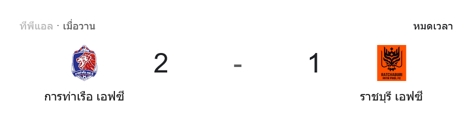 - 🔚 นาทีที่ 97 การท่าเรือได้ฟรีคิกแดนหลัง ก่อนควบคุมจังหวะจนผู้ตัดสินเป่านกหวีดหมดเวลา จบเกม การท่าเรือชนะ 2-1