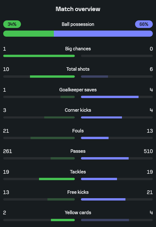 ถ้าดูจากตัวเลขในช่อง Match overview จะเห็นชัดว่ารูปเกมไม่ได้ขาดลอยอย่างที่สกอร์บอก การท่าเรือปล่อยให้ราชบุรีครองบอลมากกว่าแบบเกือบสองเท่า เจ้าถิ่นมีเปอร์เซ็นต์ครองบอลเพียงราว 34% ขณะที่ราชบุรีขึงเกมบุกยาวๆ ถึง 66% แต่จุดสำคัญอยู่ที่ความคมและการจัดการจังหวะใหญ่ การท่าเรือสร้างโอกาสจะแจ้งได้ 1 ครั้งและเปลี่ยนเป็นประตูได้ทั้งหมด ยิงรวม 10 ครั้ง มากกว่าราชบุรีที่มีโอกาสยิงเพียง 6 หน
