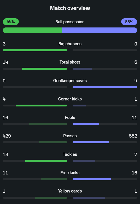 แม้เปอร์เซ็นต์การครองบอลจะชี้ไปทางอุทัยธานีที่ถือบอลมากกว่าราว 56% ต่อ 44% แต่สถิติเชิงคุณภาพนั้นเป็นของบีจีแบบเบ็ดเสร็จ เจ้าบ้านสร้างจังหวะยิงรวม 14 ครั้ง มีโอกาสจะแจ้งสามหนและเปลี่ยนเป็นสี่ประตู ขณะที่อุทัยธานียิงได้เพียง 6 ครั้ง ส่วนใหญ่เป็นการลองส่องไกลนอกกรอบ