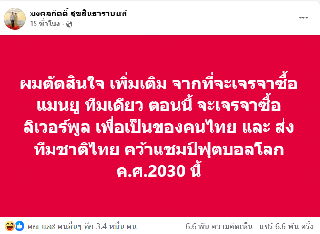 ผมตัดสินใจ เพิ่มเติม จากที่จะเจรจาซื้อ แมนยู ทีมเดียว ตอนนี้ จะเจรจาซื้อ ลิเวอร์พูล เพื่อเป็นของคนไทย และ ส่งทีมชาติไทย คว้าแชมป์ฟุตบอลโลก ค.ศ.2030 นี้