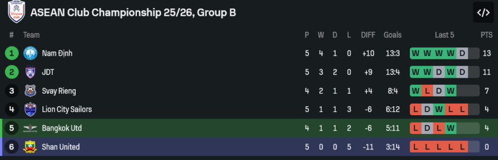 🧮 สถานการณ์ในตารางคะแนน ASEAN Club Championship กลุ่มบี