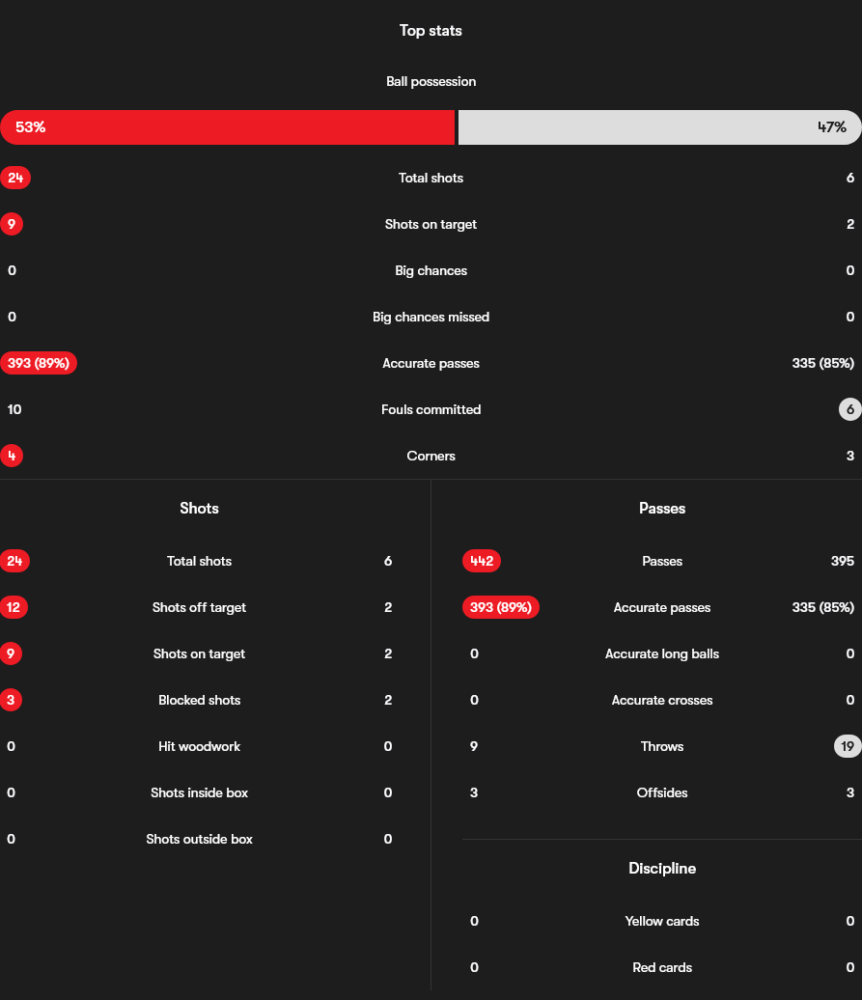 ตลอดเกมทรู แบงค็อก ยูไนเต็ดครองบอลเหนือกว่านิดๆ ที่ 53% ต่อ 47% แต่สิ่งที่สะท้อนความต่างชัดที่สุดคือปริมาณการเข้าทำ เจ้าถิ่นยิงรวม 24 ครั้ง เข้ากรอบ 9 ครั้ง ขณะที่ฉาน ยูไนเต็ดมีโอกาสยิงเพียง 6 ครั้ง เข้ากรอบ 2 ครั้ง เกมจ่ายบอลเจ้าถิ่นก็แน่นกว่า ผ่านบอลสำเร็จ 393 ครั้ง ความแม่น 89% ส่วนทีมเยือนสำเร็จ 335 ครั้ง ความแม่น 85% ฟาวล์เจ้าถิ่น 10 ครั้ง ทีมเยือน 6 ครั้ง เตะมุม 4 ต่อ 3 และฉาน ยูไนเต็ดล้ำหน้า 3 ครั้ง สะท้อนว่าจังหวะหนีสวนหลายครั้งยังไม่เนียนพอจะเปลี่ยนเกมได้