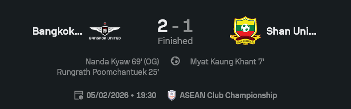 จาก : ผลบอลสด Shopee Cup ระหว่าง ทรู แบงค็อก ยูไนเต็ด 2-1 ฉาน ยูไนเต็ด วันนี้ 5/2/69 – บ้านกีฬา