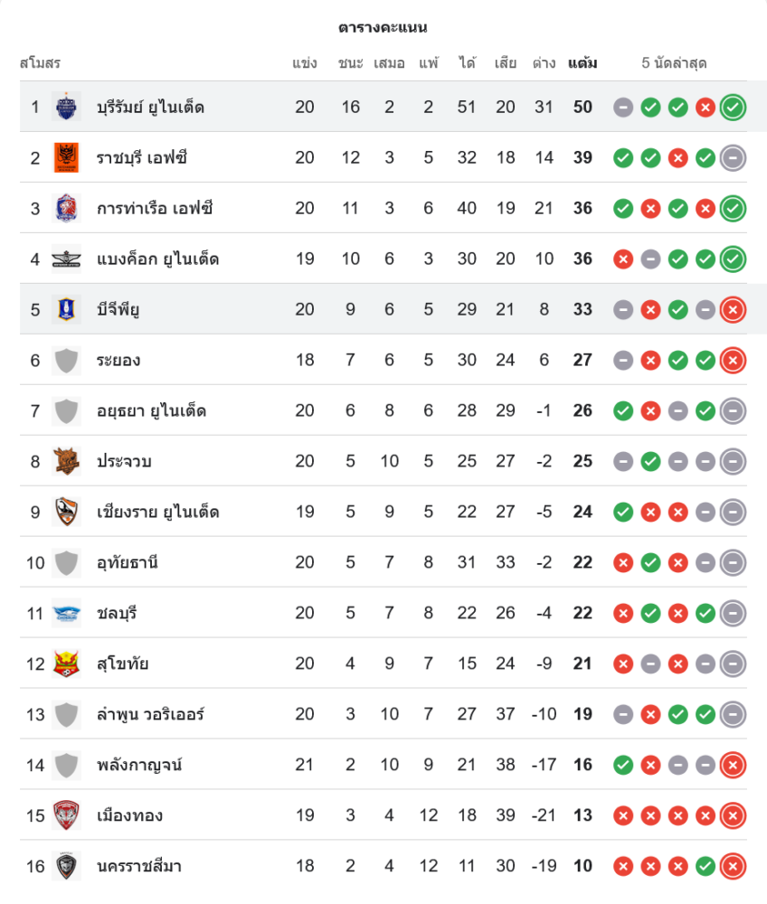 ด้านบีจี ปทุม ยูไนเต็ด แพ้นัดสำคัญคาบ้าน ทำให้ยังคงมี 33 คะแนนจาก 20 นัด หล่นห่างจากกลุ่มลุ้นแชมป์พอสมควร รั้งอันดับ 5 ของตาราง ตามหลังรองจ่าฝูงอย่างราชบุรี เอฟซี ถึง 6 แต้ม และตามหลังจ่าฝูงบุรีรัมย์ถึง 17 แต้ม เส้นทางลุ้นแชมป์เริ่มเลือนราง แต่ยังมีโอกาสเบียดพื้นที่หัวตารางและโควต้าเอเชีย หากกลับมารวมสมาธิให้ได้ในช่วงโค้งต่อไป