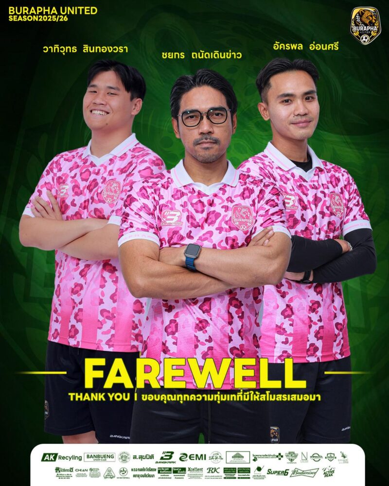 สโมสร บูรพา ยูไนเต็ด กล่าวว่า “ขอขอบคุณทีมงานสตาฟฟ์โค้ชทั้ง 3 ท่าน สำหรับความทุ่มเทและการทำงานหนักเพื่อสโมสรเสมอมา ขออวยพรให้ประสบความสำเร็จในเส้นทางอาชีพต่อไป”
