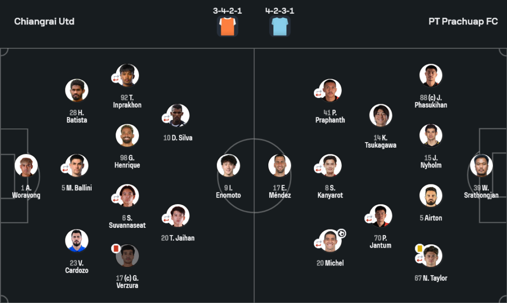 - 🔁 นาที 89 ช่วงท้ายเกม พีที ประจวบ เปลี่ยนสองคน ส่ง ชิษณุพงศ์ พิมพ์สังข์ แทน สหรัฐ กันยะโรจน์ และ อี จอง ฮยอพ แทน มิเชล ลีมา ส่วนเชียงรายส่ง ปิยพล ผานิชกุล ลงแทน ธวัชชัย อินทร์ประโคน หวังทุ่มหมดหน้าตัก