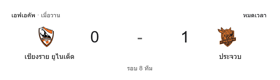 - ⏱️ ช่วงทดเวลาบาดเจ็บ เชียงรายบุกกดดันต่อเนื่อง แต่แนวรับประจวบยืนกันแน่น ก่อนผู้ตัดสินเป่าจบเกมให้ทีมเยือนเก็บชัย 1-0