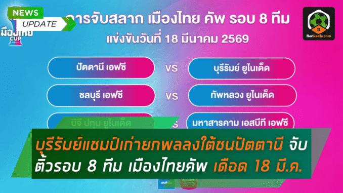 เดือดแน่รอบนี้ เพราะ บุรีรัมย์ ยูไนเต็ด แชมป์เก่าตัวจริงเสียงจริง ต้องลงใต้บุกชนปัตตานีแบบไม่มีที่ให้พลาด ขณะที่ “ทัพหลวง ยูไนเต็ด” ทีมเดียวจากไทยลีก 3 เจองานหนักปะทะชลบุรี ส่วน บีจี ปทุม ยูไนเต็ด กับ การท่าเรือ เอฟซี ได้คิวเล่นในบ้าน ลุ้นตั๋วตัดเชือกกันแบบเน้นๆ ในศึก เมืองไทย คัพ รอบ 8 ทีมสุดท้าย ที่เตรียมคิกออฟวันพุธที่ 18 มีนาคมนี้