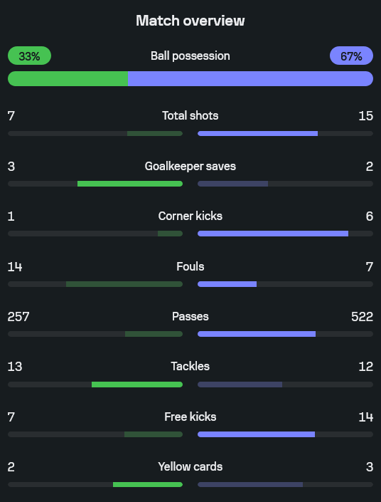 เกมนี้แบงค็อกครองบอลเหนือกว่าชัดเจน 67 ต่อ 33 และยิงรวมมากถึง 15 ครั้ง ขณะที่ลำพูนมี 7 ครั้ง แต่ความต่างสำคัญคือคุณภาพโอกาสช่วงครึ่งแรกของลำพูนคมกว่า ด้านจำนวนเตะมุมทีมเยือนได้ถึง 6 ครั้ง ส่วนลำพูนมี 1 ครั้ง สะท้อนว่าบอลอยู่หน้ากรอบเจ้าถิ่นบ่อยมาก สถิติการผ่านบอลก็ชัด 522 ต่อ 257 แบงค็อกเป็นฝ่ายคุมจังหวะและบีบให้ลำพูนถอยต่ำ ขณะเดียวกันเกมนี้มีการฟาวล์เยอะจากลำพูน 14 ครั้ง ส่วนแบงค็อก 7 ครั้ง และใบเหลืองรวมออกฝั่งละหลายใบ ซึ่งเป็นเหตุผลว่าทำไมช่วงท้ายเกมมันถึงเดือดและตึงทุกจังหวะ
