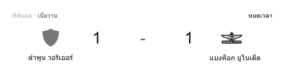 ลำพูน วอริเออร์ เปิดบ้านรับมือ ทรู แบงค็อก ยูไนเต็ด ในศึก BYD SEALION 6 ลีกหนึ่ง เกมนี้ผล ผลบอลสด จบที่ 1-1 แบบดราม่าหนัก เพราะเจ้าถิ่นอุตส่าห์นำตั้งแต่นาที 12 แต่ดันมาโดนทีเด็ดช่วงทดเวลาบาดเจ็บนาที 90+8 จนต้องแบ่งแต้มกันไปแบบคาใจแฟนบอล