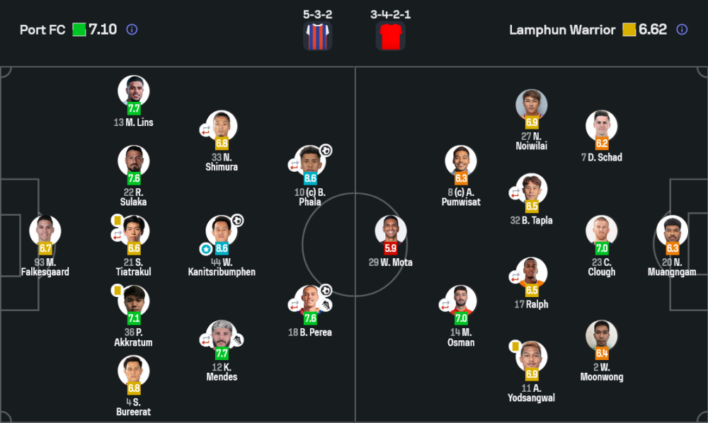 ด้านลำพูน วอริเออร์ ใช้ระบบ 3-4-2-1 ที่พยายามสร้างเกมผ่านมิดฟิลด์ตัวรุก แต่ปัญหาคือการครองบอลในแดนกลางถูกการท่าเรือบีบเร็ว ทำให้เกมรุกขาดความต่อเนื่อง