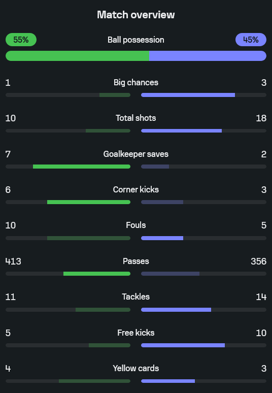 แม้บีจีจะครองบอลมากกว่า 55 เปอร์เซ็นต์ และผ่านบอลมากกว่า 413 ต่อ 356 แต่ชลบุรีคือทีมที่อันตรายกว่าอย่างชัดเจน เพราะสร้างโอกาสสำคัญได้ 3 ครั้ง ขณะที่บีจีมีเพียง 1 ครั้ง และจำนวนยิงรวมของชลบุรีก็มากกว่าถึง 18 ต่อ 10 อีกจุดที่สะท้อนภาพเกมชัดมากคือ สรานนท์ต้องเซฟถึง 7 ครั้ง ส่วนผู้รักษาประตูชลบุรีเซฟเพียง 2 ครั้งเท่านั้น แปลว่าทีมเยือนเข้าทำได้จะแจ้งและบีบเจ้าถิ่นได้หนักกว่าเยอะ