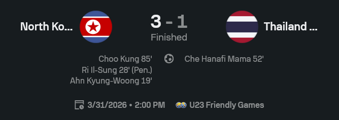 เมื่อไทยเปิดเกมมากขึ้น ช่องว่างด้านหลังก็ยิ่งชัด และนาที 86 ชเว กุ๊ก หลุดเข้าไปยิงปิดเกมให้เกาหลีเหนือชนะ 3-1 ส่ง ผลบอลสด นัดนี้ให้ไทยต้องกลับไปแก้การบ้านอีกหลายจุด
