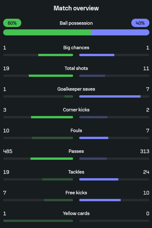 หากดูจากตัวเลข บ้านผลบอล จะเห็นชัดว่าแบงค็อกเหนือกว่าทั้งรูปเกมและความต่อเนื่อง เจ้าถิ่นครองบอล 60 เปอร์เซ็นต์ ยิง 19 ครั้ง ขณะที่สุโขทัยครองบอล 40 เปอร์เซ็นต์ ยิง 11 ครั้ง ผู้รักษาประตูสุโขทัยต้องเซฟถึง 7 หน ส่วนปฏิวัติ คำไหม มีงานเพียง 1 ครั้งเท่านั้น แบงค็อกยังผ่านบอลมากกว่าอย่างชัดเจนที่ 485 ต่อ 313 และได้เตะมุม 3 ครั้ง เทียบกับสุโขทัย 2 ครั้ง