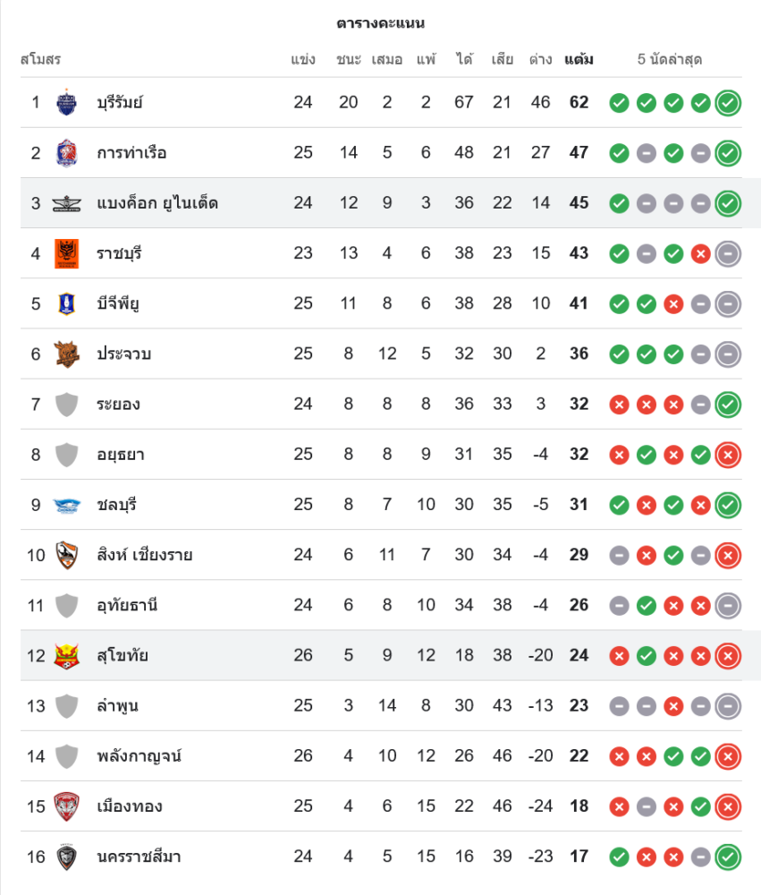 ด้านสุโขทัย เอฟซี ยังอยู่อันดับ 12 มี 24 แต้มจาก 26 นัด สถานการณ์ยังไม่หลุดอันตราย แต่ก็ยังวางใจไม่ได้ เพราะทีมด้านล่างเริ่มขยับเข้ามาใกล้ขึ้นเรื่อย ๆ