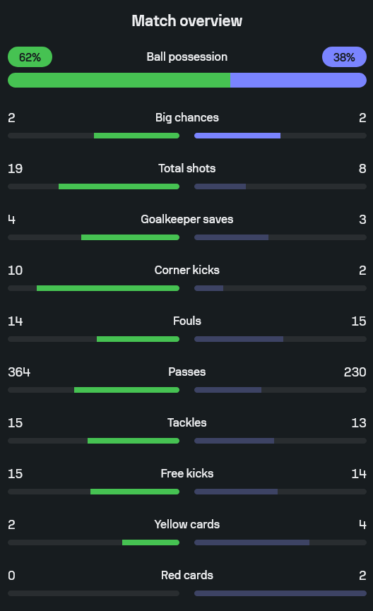เกมนี้เมืองทองเหนือกว่าค่อนข้างชัดในภาพรวม พวกเขาครองบอล 62 เปอร์เซ็นต์ ขณะที่เชียงรายมี 38 เปอร์เซ็นต์ ผ่านบอลมากกว่า 364 ต่อ 230 ครั้ง และยิงรวม 19 ครั้ง เทียบกับเชียงรายที่ยิง 8 ครั้ง แม้โอกาสจะแจ้งจะมีเท่ากันทีมละ 2 ครั้ง แต่เมืองทองกดดันได้ต่อเนื่องกว่ามาก โดยเฉพาะลูกเตะมุมที่มีถึง 10 ครั้ง ส่วนเชียงรายได้เพียง 2 ครั้งเท่านั้น