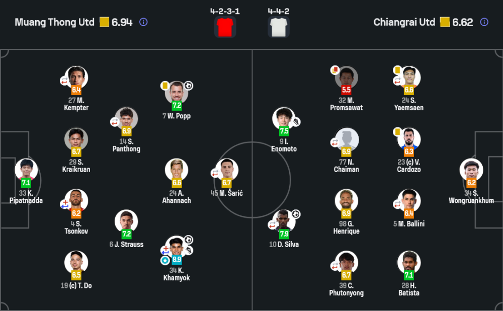 - เปลี่ยนตัว : เมลวิน ลอเรนเซน 6.7, สิรดนัย โพธิ์ศรี 7.1, กรวิชญ์ ทะสา 7.4, วัฒนากรณ์ สวัสดิ์ละคร 6.7, ธีรภัทร์ นันทโกวัฒน์ 6.7