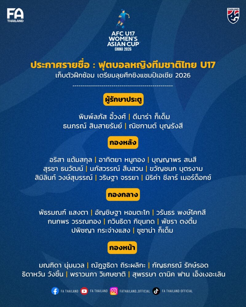 สมาคมกีฬาฟุตบอลแห่งประเทศไทย ประกาศรายชื่อ ฟุตบอลหญิงทีมชาติไทย U17 จำนวน 27 คน เข้าแคมป์เก็บตัวฝึกซ้อม เพื่อเตรียมความพร้อมสำหรับศึกฟุตบอลหญิงชิงแชมป์เอเชีย รุ่นอายุไม่เกิน 17 ปี 2026 หรือ AFC U17 Women’s Asian Cup China 2026 ซึ่งจะจัดขึ้นระหว่างวันที่ 1-17 พฤษภาคม 2569 ณ เมืองซูโจว สาธารณรัฐประชาชนจีน
