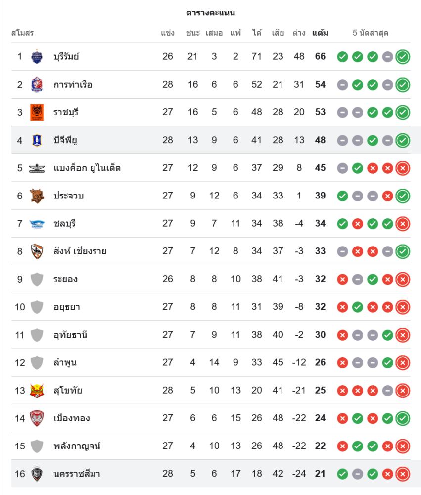 ส่วนนครราชสีมา เอฟซี ยังอยู่อันดับ 16 มี 21 คะแนน จาก 28 นัด ชนะ 5 เสมอ 6 แพ้ 17 ยิงได้ 18 เสีย 42 ผลต่าง -24 สถานการณ์หนีท้ายตารางยังหนัก และทุกเกมที่เหลือคือเกมชี้ชะตาโดยตรง