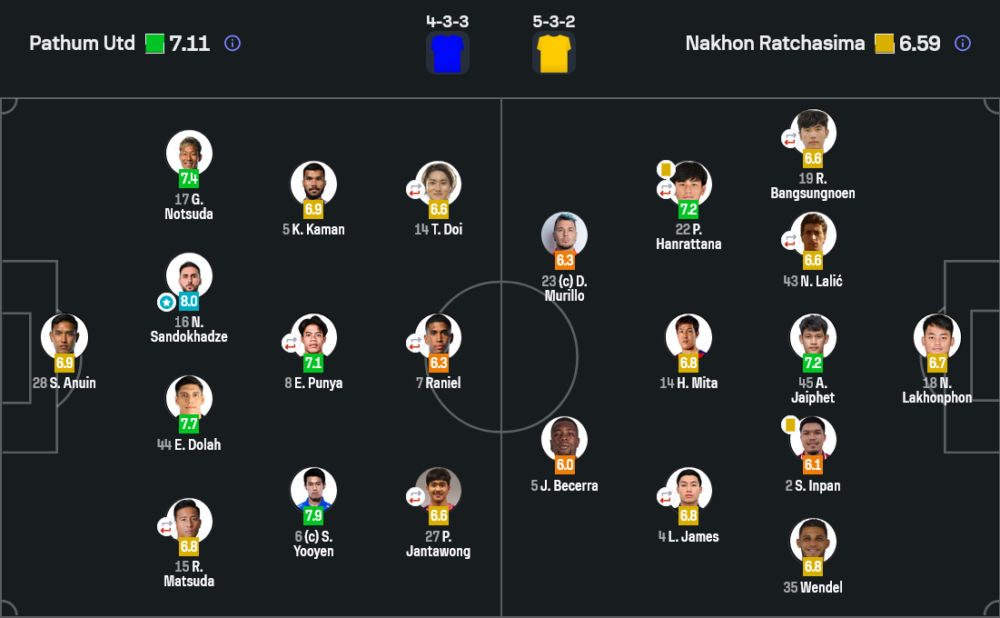 • กองหน้า : พงศ์รวิช จันทวงษ์ 6.6, รานีเอล 6.3, โทโมยุกิ โดอิ 6.6
