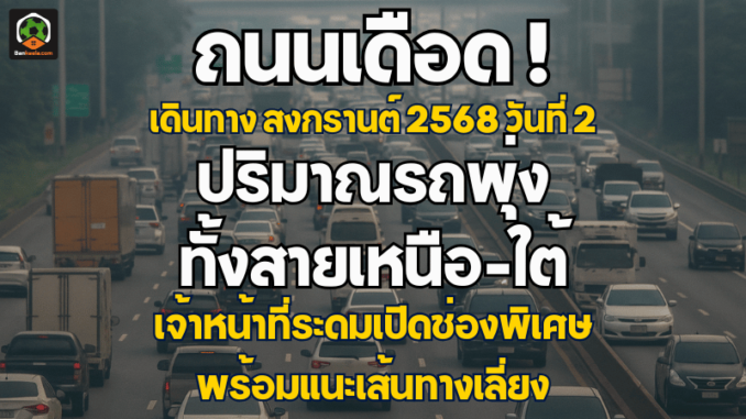 การเดินทางช่วงหยุดยาวสงกรานต์ 2568 เดินหน้าสู่วันที่สองแล้ว และภาพรวมการจราจรยังคงตึงเครียดไม่แพ้วันแรก โดยเฉพาะบนถนนสายหลักอย่าง สายเอเชีย, ถนนพระราม 2, และ ถนนมิตรภาพ ที่พบว่ามีปริมาณรถสะสมหนาแน่นตั้งแต่ช่วงเช้ามืด แม้จะมีการเปิด ทางด่วนฟรี และมอเตอร์เวย์หลายสายเพื่อบรรเทาการจราจร แต่ด้วยจำนวนรถที่หลั่งไหลออกจากกรุงเทพฯ อย่างมหาศาล ทำให้หลายจุดเกิดการชะลอตัวและติดขัดเป็นระยะ