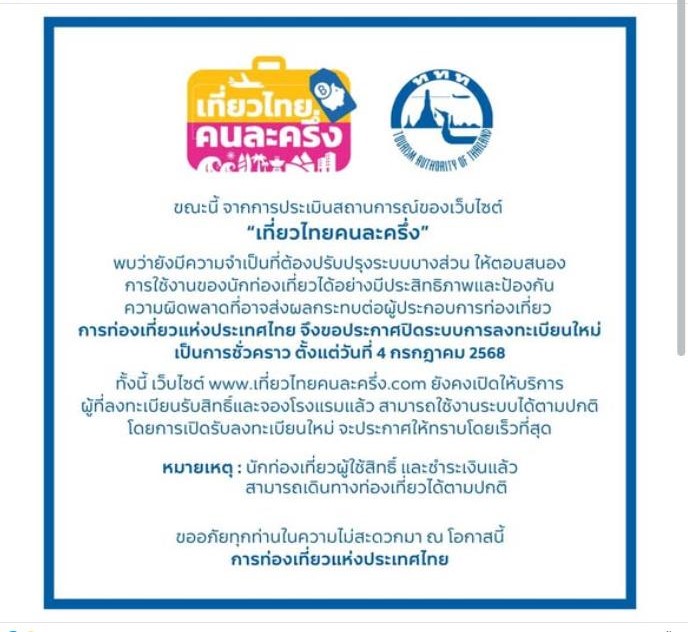 ผู้ว่าการ ททท. นางสาวฐาปนีย์ เกียรติไพบูลย์ ชี้แจงตรงไปตรงมาว่า ระบบยังไม่พร้อมและมีความเสี่ยงกระทบต่อผู้ประกอบการ จึงจำเป็นต้องปิดการลงทะเบียนชั่วคราวตั้งแต่ 4 กรกฎาคม 2568 แต่ย้ำว่าผู้ที่จองสิทธิ์และชำระเงินแล้วสามารถเดินทางได้ตามปกติ
