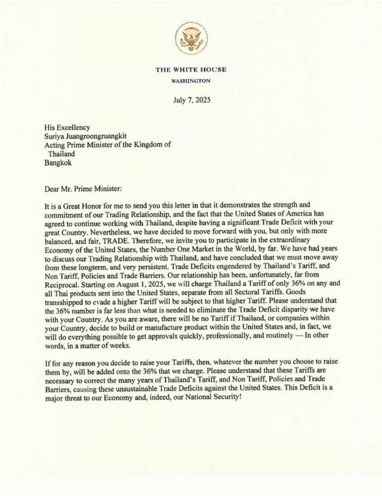 จดหมายยังย้ำชัดว่า “36% ยังถือว่าน้อยกว่าที่ควรเป็น” พร้อมทิ้งท้ายด้วยถ้อยคำเสียดสีว่า “You will never be disappointed with The United States of America” ซึ่งไม่ใช่คำปลอบใจ แต่คือประกาศว่า ถ้าไทยเดินตามเกมสหรัฐฯ จะได้สิ่งตอบแทน แต่หากขัดขืน…ก็พร้อมเดินหน้าเพิ่มอัตราภาษีอีกทันที