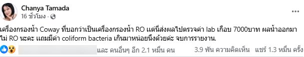 สิ่งที่ทำให้เธอต้องออกมาโพสต์ไม่ใช่แค่ผลตรวจ แต่เป็นเพราะความรู้สึกว่า บริการหลังการขายของ Coway ไม่แสดงความใส่ใจเพียงพอ เมื่อเธอแจ้งเรื่อง พนักงานตอบสั้นๆ ให้ส่งอีเมลเองโดยไม่มีท่าทีช่วยเหลือ ทำให้เธอในฐานะลูกค้าที่รักสุขภาพและจ่ายเงินค่าตรวจเองกว่า 7,000 บาท รู้สึกไม่โอเคและเลือกแชร์ประสบการณ์ออกสู่สาธารณะ