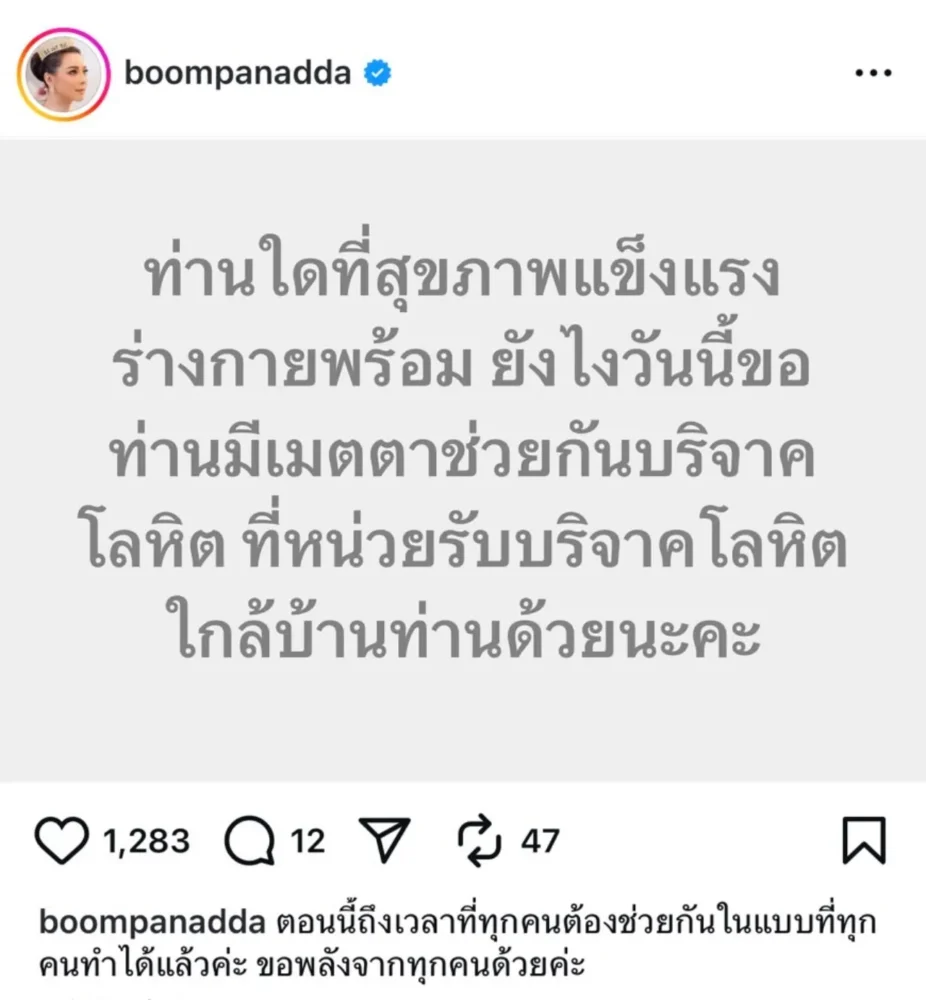 “ท่านใดที่สุขภาพแข็งแรงร่างกายพร้อม ยังไงวันนี้ขอท่านมีเมตตาช่วยกันบริจาคโลหิต ที่หน่วยรับบริจาคโลหิตใกล้บ้านท่านด้วยนะคะ”