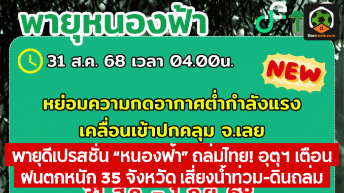 เมื่อวันที่ 31 สิงหาคม 2568 กรมอุตุฯ ระบุว่า หย่อมความกดอากาศต่ำจาก พายุดีเปรสชั่นหนองฟ้า เคลื่อนตัวตามแนวร่องมรสุม เข้าปกคลุมจังหวัดเลย และคาดว่าจะเลื่อนขึ้นไปปกคลุมภาคเหนือในวันนี้ ผลคือประเทศไทยแทบทุกภาคมีฝนตกต่อเนื่อง โดยหลายพื้นที่เจอฝนตกหนักถึงหนักมาก เสี่ยงเกิด น้ำท่วมฉับพลัน น้ำป่าไหลหลาก และดินถล่ม