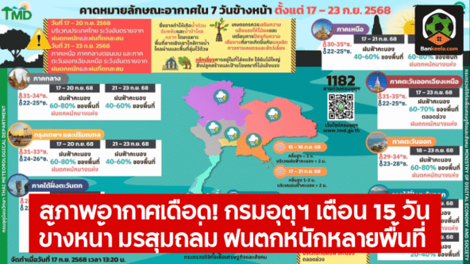 - 22–25 ก.ย. : ระวังฝนหนักสะสม เสี่ยงน้ำท่วมฉับพลัน