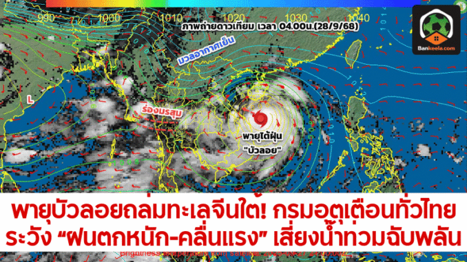 กรมอุตุนิยมวิทยาออกประกาศเตือนล่าสุดเกี่ยวกับ พายุไต้ฝุ่นบัวลอย (BUALOI) ที่กำลังเคลื่อนตัวเข้าฝั่งประเทศเวียดนามตอนบน ซึ่งจะส่งผลกระทบโดยตรงต่อประเทศไทย โดยเฉพาะในช่วงวันที่ 28–30 กันยายน 2568 ที่จะมี ฝนตกหนักถึงหนักมาก หลายพื้นที่ พร้อมเตือนประชาชนให้เฝ้าระวังภัยจากน้ำท่วมฉับพลัน น้ำป่าไหลหลาก และคลื่นลมแรงบริเวณชายฝั่งทะเล