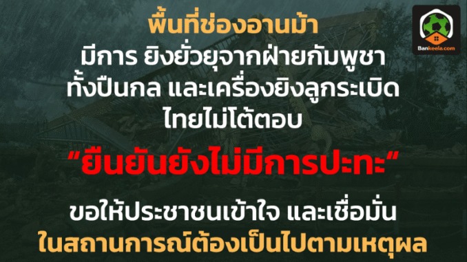 เพจ “กองทัพบก ทันกระแส” ออกมาโพสต์ว่า เหตุการณ์ที่เกิดขึ้นเป็นการยิงยั่วยุจากฝ่ายกัมพูชาโดยใช้ปืนกลและเครื่องยิงลูกระเบิด แต่ไม่มีการโต้กลับจากฝ่ายไทย พร้อมเรียกร้องให้ประชาชนมั่นใจในมาตรการควบคุมสถานการณ์