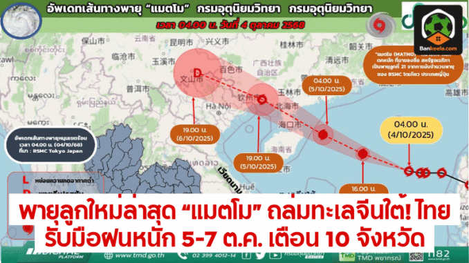 พายุลูกใหม่ล่าสุด “แมตโม” ถล่มทะเลจีนใต้! ไทยรับมือฝนหนัก 5–7 ต.ค. เตือน 10 จังหวัดภาคกลางเสี่ยงน้ำท่วม