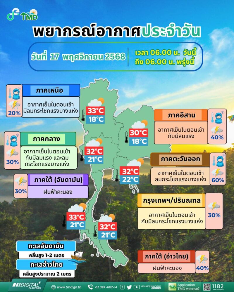 ภาคเหนือ – อากาศเย็นตอนเช้า + ฝน 20% + ลมแรงบางแห่ง