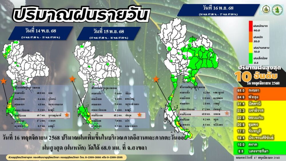18 พ.ย. 68 → เพชรบุรี นครศรีฯ พัทลุง สงขลา ระนอง พังงา